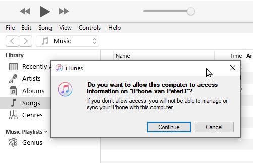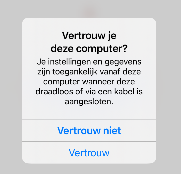 Verbind je telefoon met je laptop met een USB kabel. Je krijgt in iTunes de vraag: