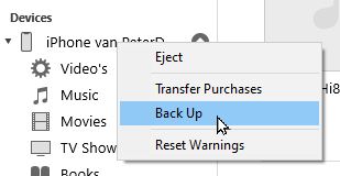 Daarna verschijnt je telefoon in de linkerkolom in iTunes. Klik daar rechts op en kies voor Back Up