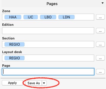 Stel daar de selectie samen die je wilt zien; de edities, de desk (REGIO) de sectie (REGIO) en klik op Apply. Is dat een handig overzicht? Klik op Save As en geef je favoriet een zinnige naam.