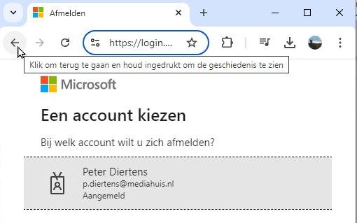 Klik NIET op je account om je daar helemaal af te melden maar kies voor de Terug knop van je browser: