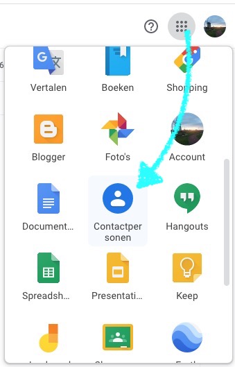 Klik rechtsboven op het rasterknopje en zoek contactpersonen.
