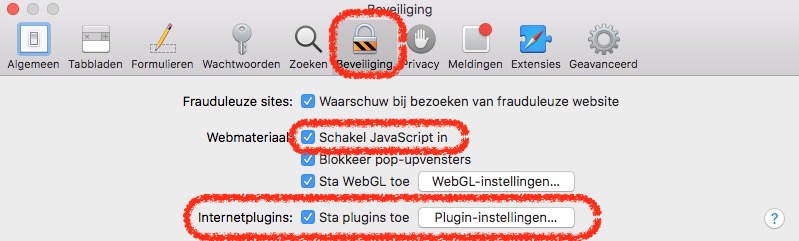 Klik op Beveiliging, schakel JavaScript in, sta plugins toe en selecteer met de knop de Adobe Flash Player plugin, en zet deze aan voor de bedoelde website.
