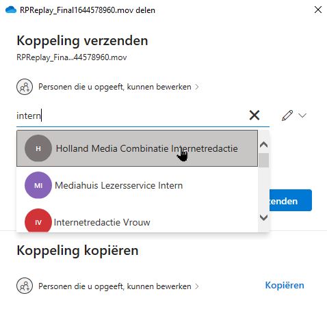 Wil je een flinke video vanuit die OneDrive map sturen aan de onlineredactie voor gebruik op de website: Klik er rechts op en kies voor delen. Adres internetredactie invullen en ze kunnen erbij.