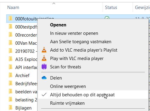 Zorg dat de inhoud daarvan altijd beschikbaar is op je laptop door de map rechts te klikken en Altijd behouden op dit apparaat te kiezen