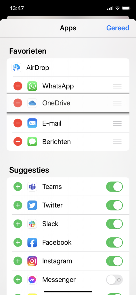 Scroll naar rechts en tik op meer… Klik rechtsboven op Bewerk en tik de Plus voor de OneDrive optie aan en sleep die vervolgens lekker hoog in je favorieten: