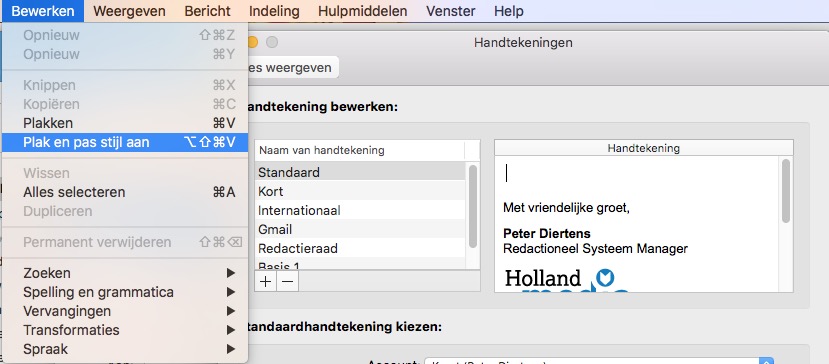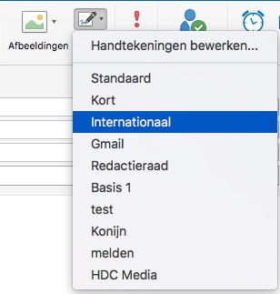 En je kunt ook leuke andere handtekeningen gebruiken, ook lange standaard antwoorden etc. Kun je selecteren uit het handtekeningen menu van een nieuwe mail.