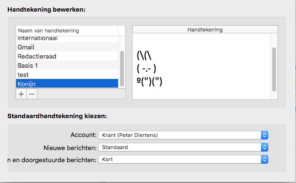 Klik op de plus onderin om een nieuwe handtekening aan te maken en plak de voorbeeldhandtekening daar in. Geef een zinnige naam.
