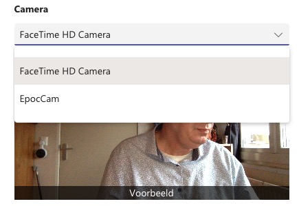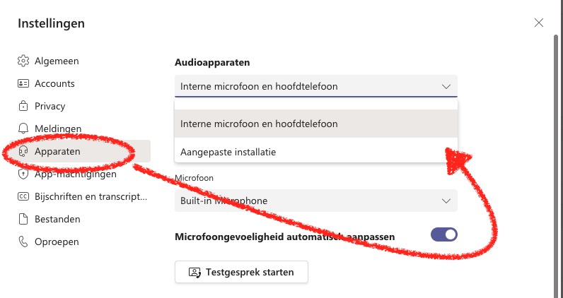 Start nu Teams op. Kies daar bij de voorkeuren (command-komma) voor de juiste geluidsinvoer/uitvoer en de juiste camera. Eerst: aangepaste installatie. Dan daaronder Luidspreker en Microfoon kiezen.