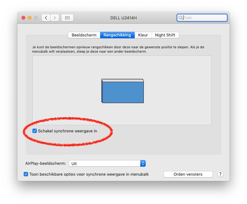 Regel via Systeemvoorkeuren > Beeldschermen dat het scherm ‘gespiegeld wordt op de grotere monitor.