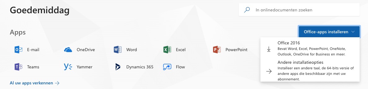 Kijk daarvoor in je webmail login.microsoftonline.com en klik linksboven op Office365.