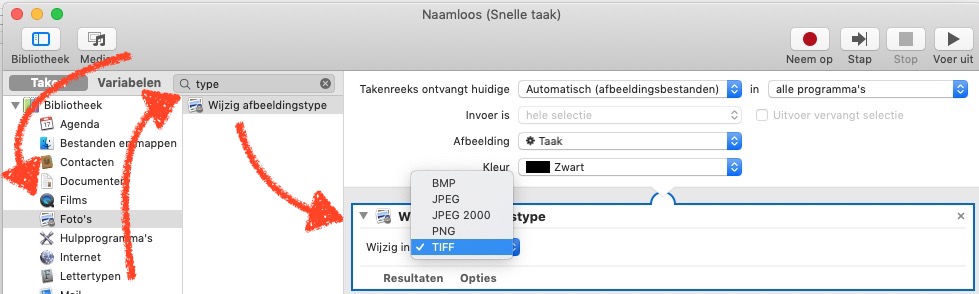 Klik in de linkerkolom op Foto’s, geef in de kolom daarnaast de zoekterm type, de taak Wijzig afbeeldingstype blijft over, sleep die naar het veld ernaast.