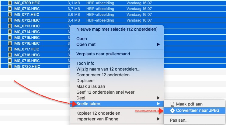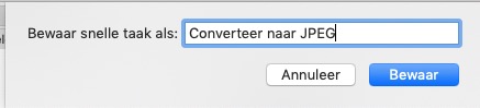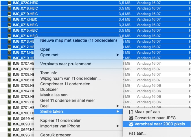 Nou hierom: Selecteer het ritsje HEIC foto’s die je naar je Mac hebt ge-airdropt, klik rechts en kies voor Snelle taken – in het submenu staat de net door jou aangemaakte taak!