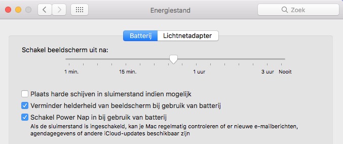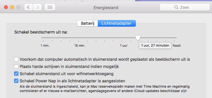 Stel voor zowel de batterij – stand als de stand met adapter de tijd voordat de Mac in slaap gaat vallen (veel) ruimer in en let op de aan/uitschakeling van de juiste vinkjes.