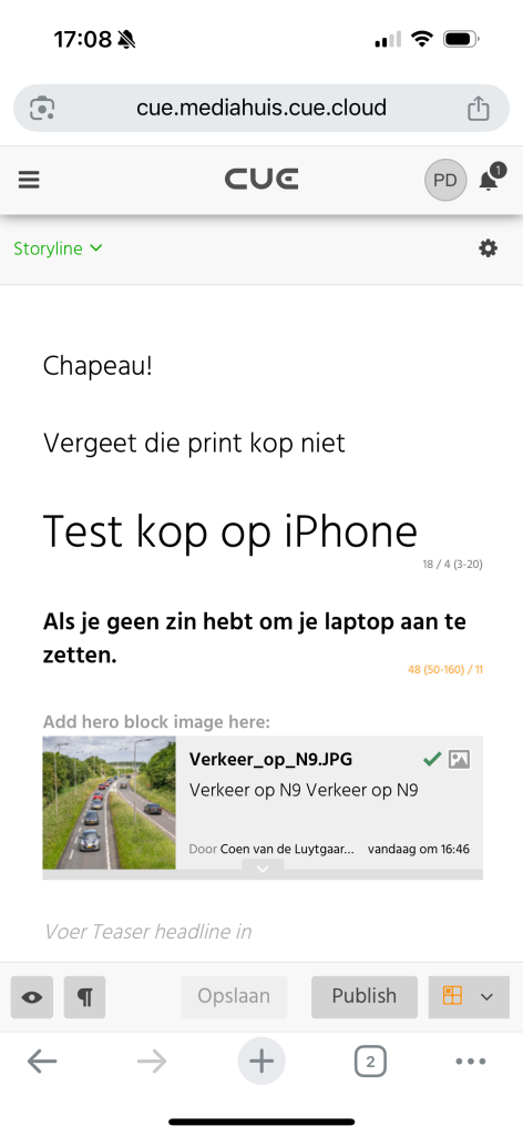 Open op je telefoon de Chrome of Safari browser – log in op https://cue.mediahuis.cue.cloud/cue-web/#/Login