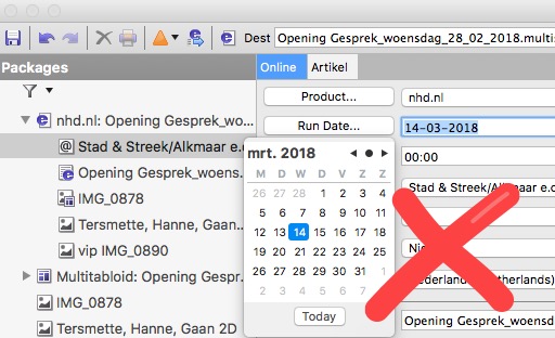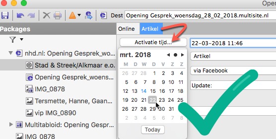 Datum-picker laat je verschijnen door op de knop Activatie tijd… te klikken. Kies een datum. De tijd – gelijk aan de huidige systeemtijd – kun je aanpassen.. Let er op dat je aan de notatie van datum tijd niets verandert. Vergeet niet het artikel naar Online te sturen. Daar wacht het in de coulissen tot het tijd is om op te komen.