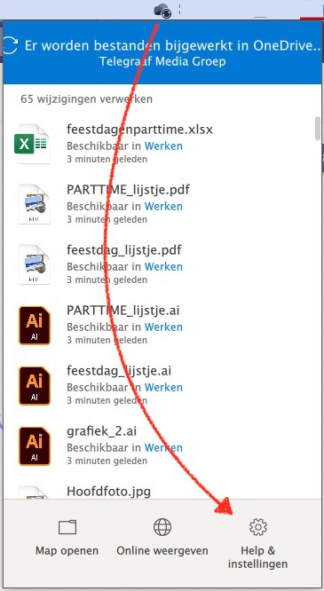 Klik op de OneDrive wolk in je systeem-balk, ga naar Help & Instellingen.