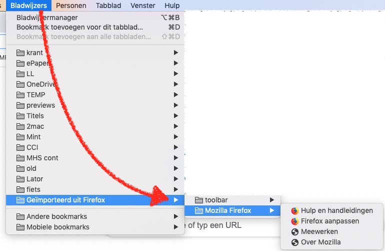De uit Firefox opgehaalde favorieten staan in een apart mapje. Hieronder zie je de standaard ‘fabrieks-‘ favorieten, dus een import uit het verkeerde Firefox profiel: