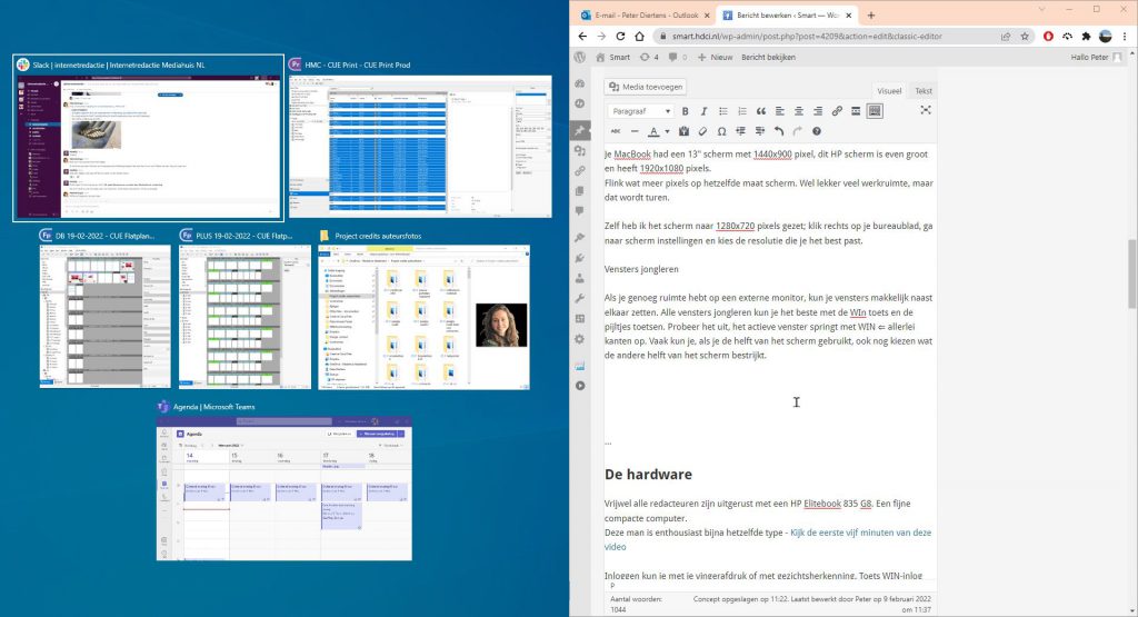 Vrijwel alle redacteuren zijn uitgerust met een HP Elitebook 835 G8. Een fijne compacte computer. Met AMD Ryzen 5 PRO processor; krachtig en zuinig; 16GB werkgeheugen en 256GB harddisk.