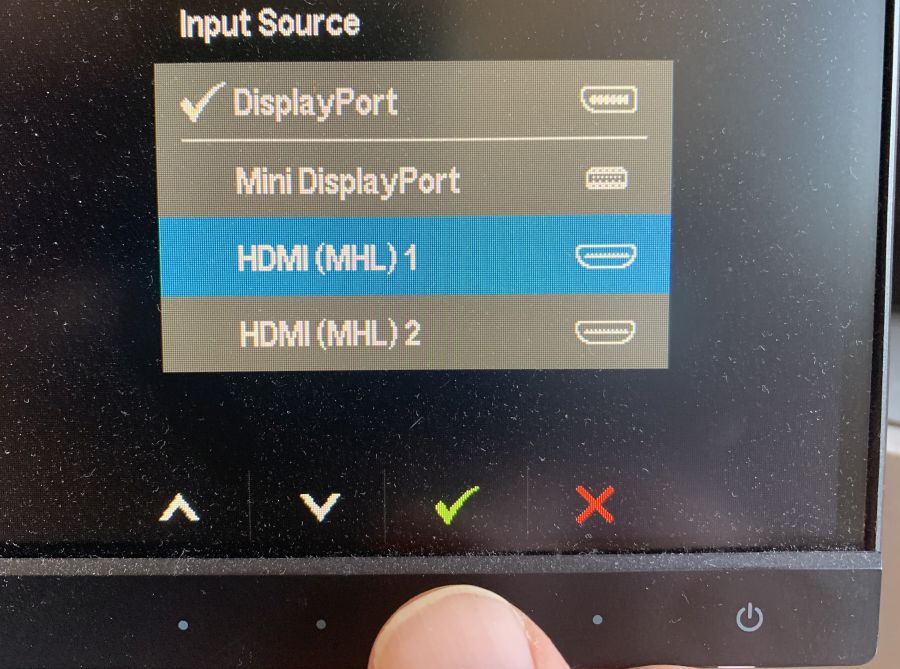 Met een HDMI kabel kun je aan de Dell monitor op je desktop verbinden. Andere ingang dan je Mac, dus de monitor moet bijgesteld, rechts onder in de rand zitten sluwe aanraakknopjes om dat te regelen:
