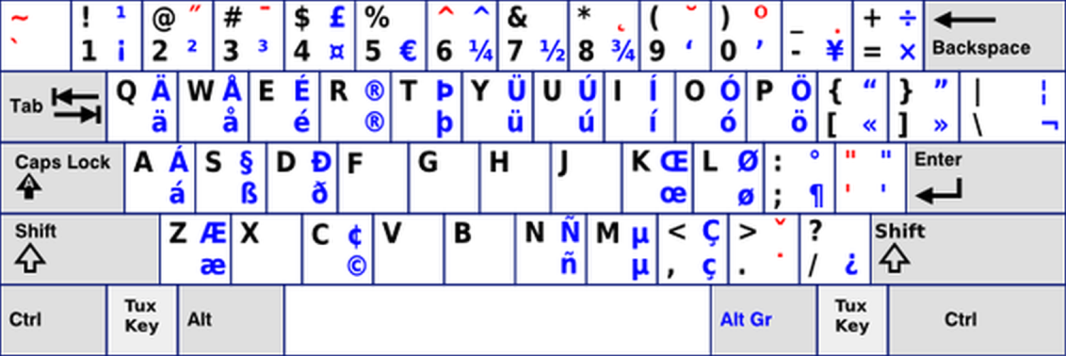 Met deze toets en met shift-alt gr kom je aan de karakters die op dit voorbeeldje blauwgedrukt zijn.