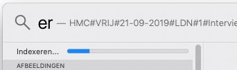 Doe een zoekopdracht – command-spatie – op een paar willekeurige letters: onder het zoekvenster zie je de voortgang van de indexering.
